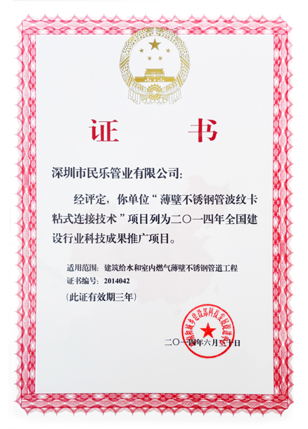 “薄壁不銹鋼管波紋卡粘式連接技術”科技成果推廣項目