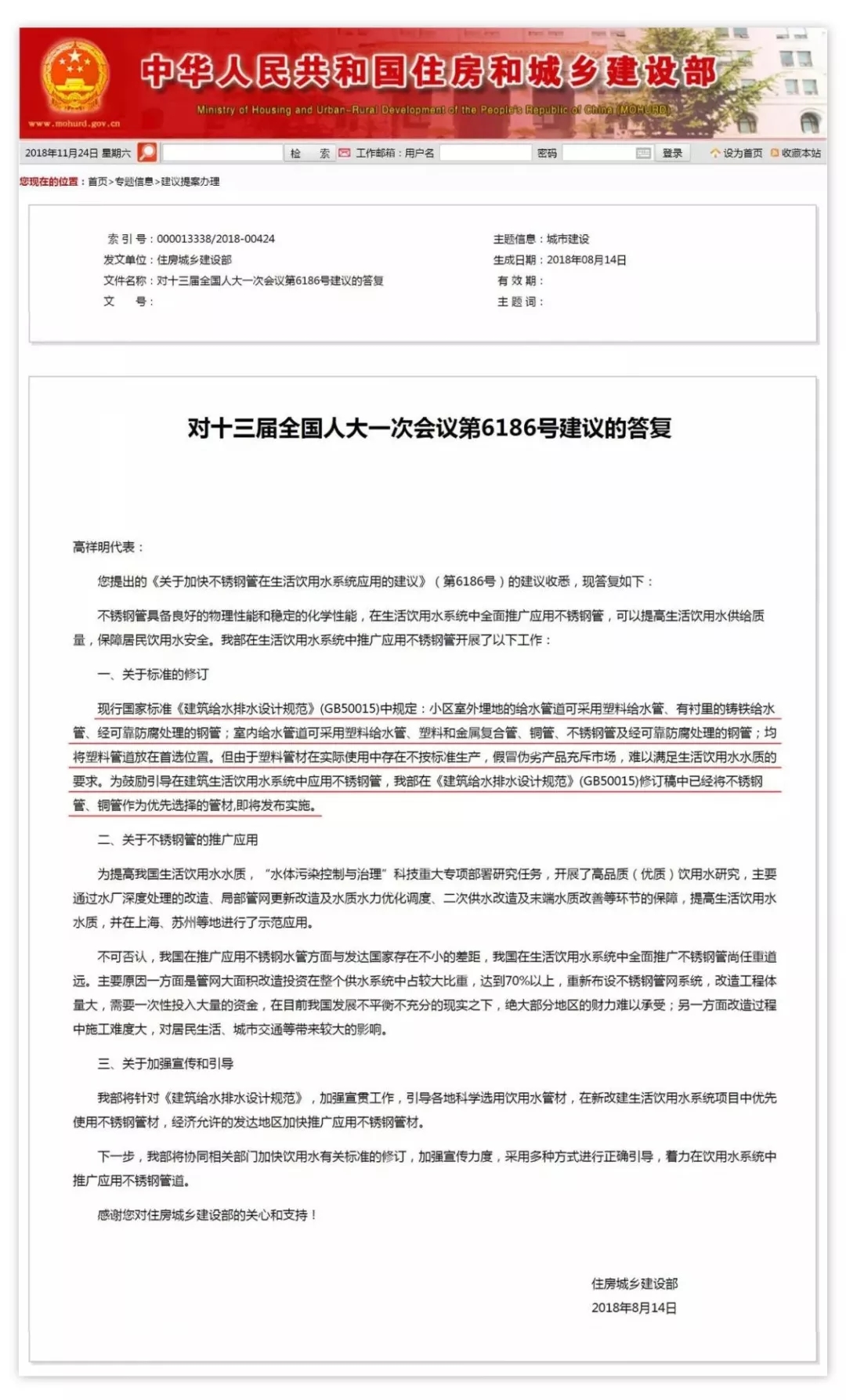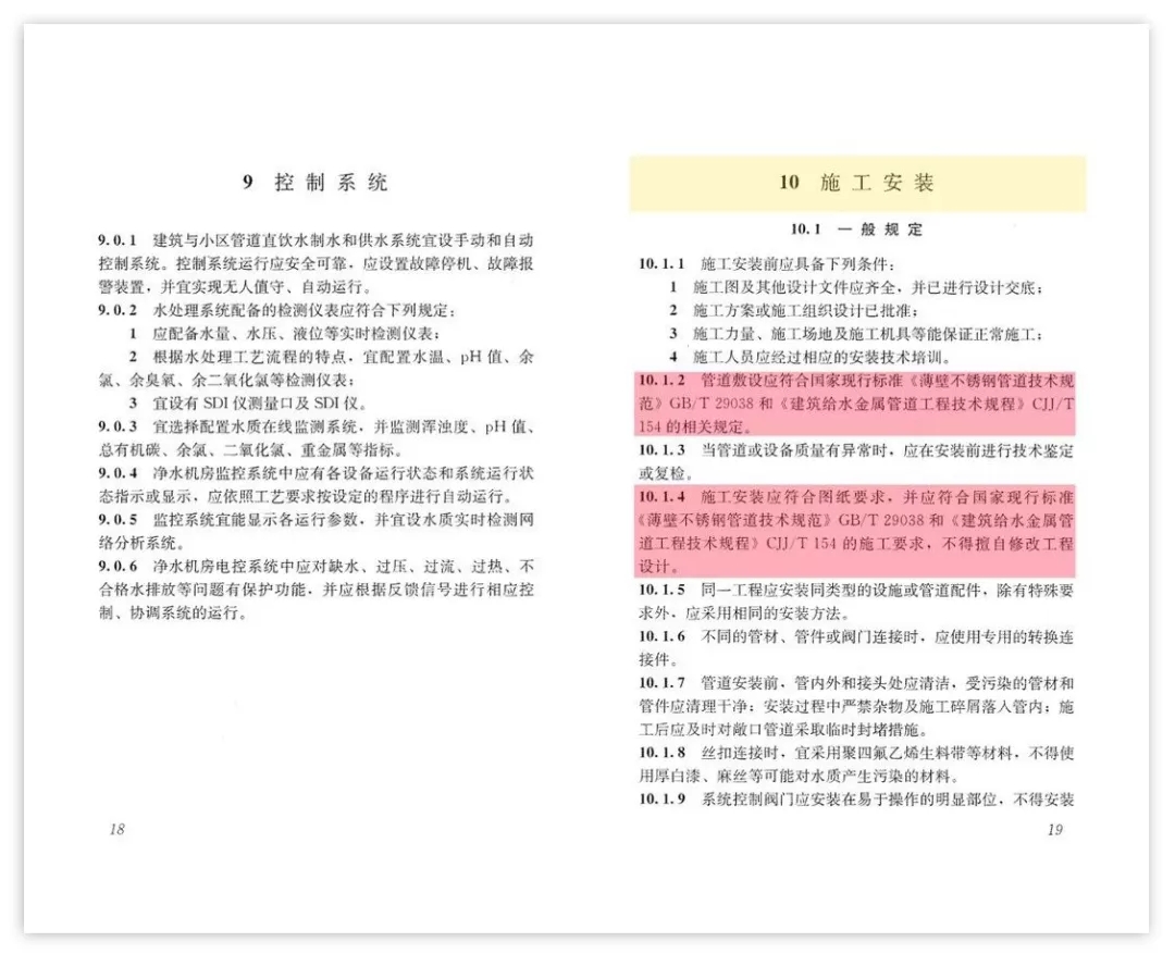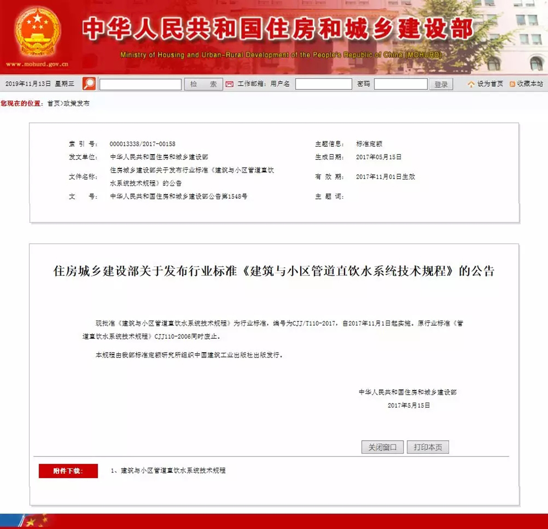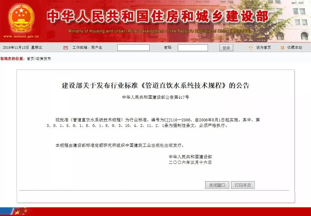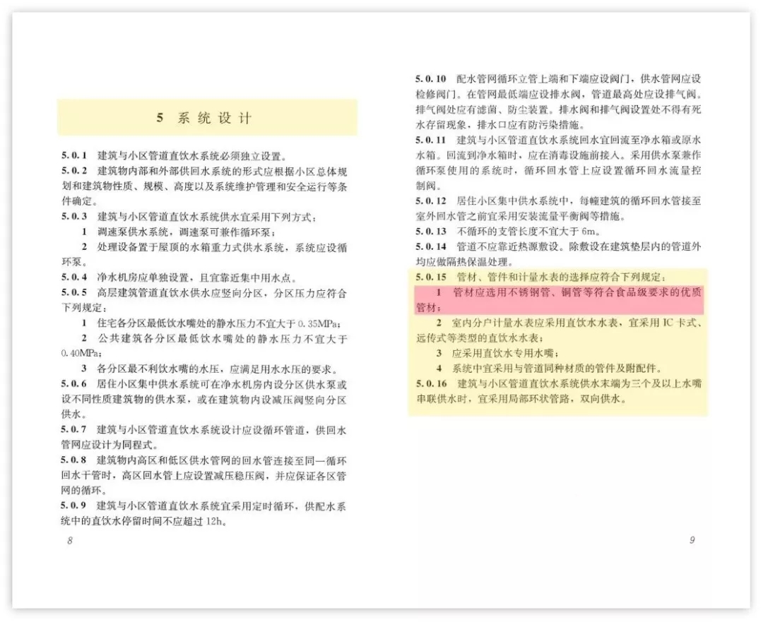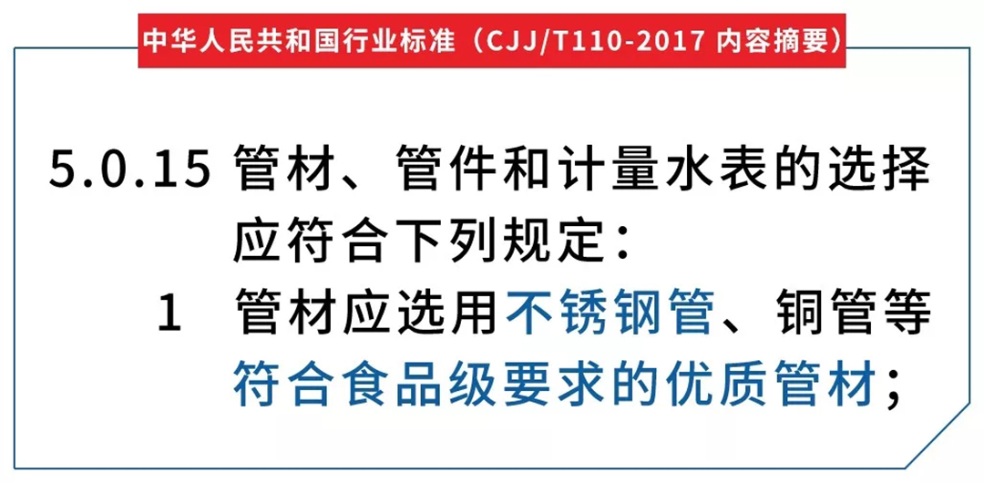 接著,住房城鄉(xiāng)建設(shè)部于2017年5月15日發(fā)布《建筑與小區(qū)管道直飲水系統(tǒng)技術(shù)規(guī)程》(編號(hào):CJJ/T110-2017),自2017年11月1日起實(shí)施。原行業(yè)標(biāo)準(zhǔn)《管道直飲水系統(tǒng)技術(shù)規(guī)程》(CJJ110-2006)同時(shí)廢止。該規(guī)程十分明確地規(guī)定:“管材應(yīng)選用不銹鋼管、銅管等符合食品級(jí)要求的優(yōu)質(zhì)管材”。