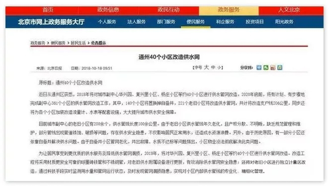 根據(jù)市發(fā)改委的批復(fù)書(shū),2020年底前,城市副中心361個(gè)小區(qū)將完成供水管網(wǎng)的改造。其中,140個(gè)小區(qū)將置換掉自備井,221個(gè)老舊小區(qū)將改造供水管網(wǎng)。此次供水管網(wǎng)改造,共計(jì)將改造支戶(hù)線206公里,同步還將為各個(gè)小區(qū)加裝改造流量計(jì)、水表等配套設(shè)施。