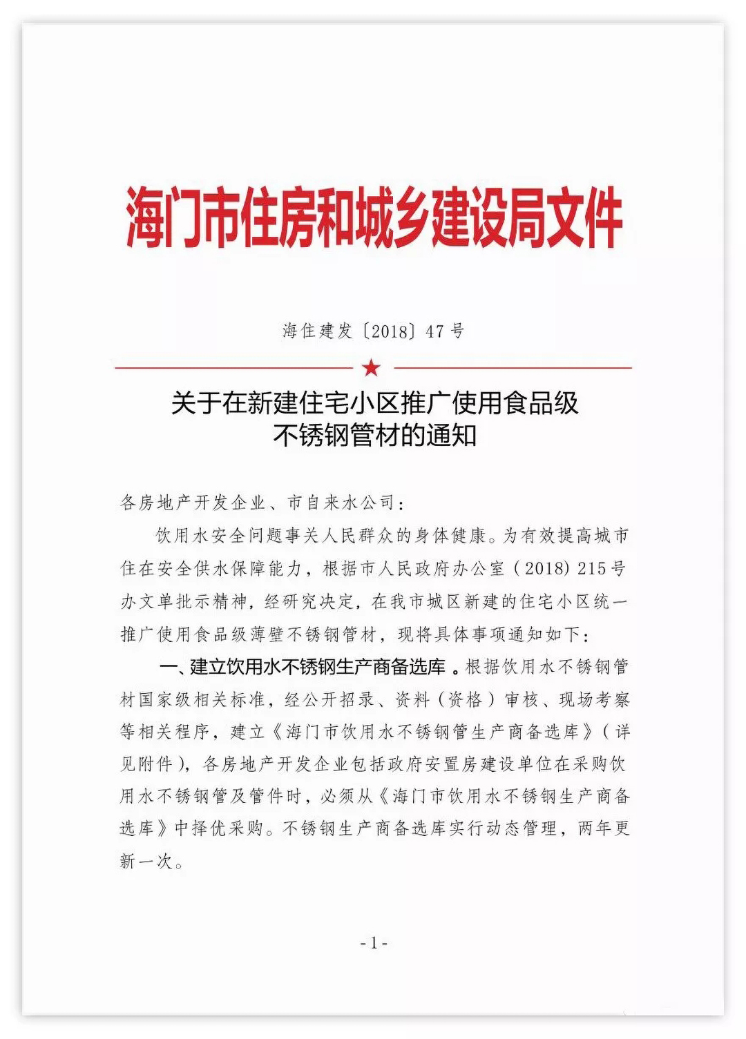 設(shè)區(qū)市城市供水主管部門(mén)可建立供水產(chǎn)品、材料、設(shè)備推薦名錄庫(kù),定期更新并向社會(huì)公布。同時(shí)建立供應(yīng)商和施工單位考評(píng)和黑名單制度,保證供水設(shè)施材料設(shè)備質(zhì)量和施工質(zhì)量安全可靠。推廣優(yōu)質(zhì)管材,DN75以上的管道材質(zhì)優(yōu)先選用鋼管、球墨鑄鐵管等管材;DN75及以下的管道優(yōu)先選用不銹鋼管。逐步推廣與直飲水標(biāo)準(zhǔn)相適應(yīng)的內(nèi)襯不銹鋼復(fù)合鋼管、薄壁不銹鋼管等優(yōu)質(zhì)管材。